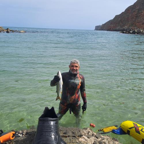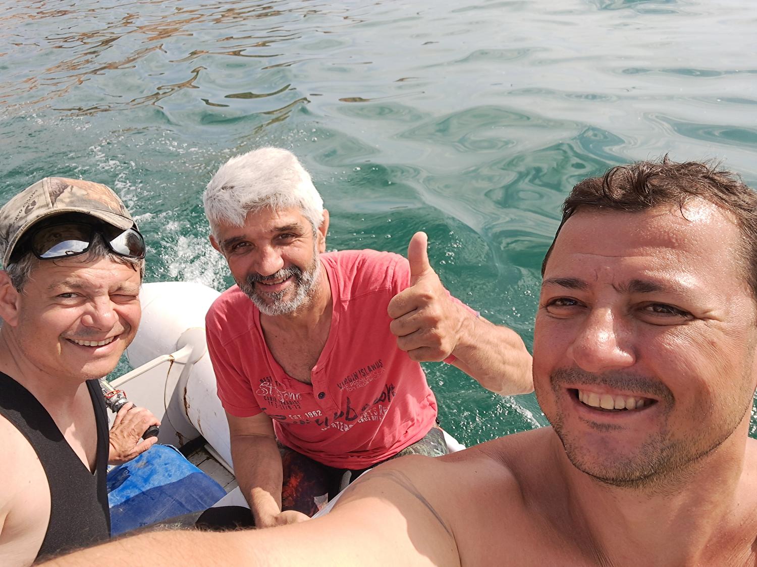 С Иво и Мария пристигнахме в петък вечерта. Групата от Шумен също пристигна в петък. Иван дойде от Благоевград на следващият ден. Натоварихме се всички на лодката и капитан Мария ни остави на определеното от Иво място. Представляваше един голям залив заобиколен от двете страни със скали. В плиткото имаше доста камъни и цисторзия а в дълбочина множество големи камъни, където да се скриеш. Водата в дълбокото беше доста по студена. След първоначалните опити да подържам нивото на Иво се отказах и се отправих в плиткото. Там за изненада открих врани, които се криеха на доста плитко под скални козирки или по точно в сянката на камъните. В началото не ги стрелях а само ги наблюдавах и запомнях местата на които се крият. После ги споделих с Ванката. След като се намесихме и стреляхме по някоя друга рибите станаха по-предпазливи и се навряха още по навътре в тъмните дупки. Опитах и да застана на носовете. Там скрит между едни скали пред мен се появи една гледка която не бях виждал от доста време. Голямо струпване на врани. Гледката беше толкова красива, че не можах да стрелям. При изплуването малко над скалите се появиха и два лефера. Тук вече нямаше никакво разколебаване, но изстрелът беше неуспешен. Върнах се в плиткото там по средата на залива между цисторзиите имаше врани е доста едри спарита. Иво беше в дълбокото беше взел няколко хубави врани. Ние бяхме излезли на едни скали и си препичахме неопрените и въобще не усетихме кога бяха минали няколко часа. Мария и Венко хващаха сафрид и дойдоха да ни вземат. На излизане провериха още едно място за сафрид. Мария хвана едно въже и се наложи Иво да се гмурне и изкара чипарето. Заедно с куките Иво извади и една котва за лодката. Така Мария пак се доказа, че няма празно. Събота е най-пълният ден от програмата. Така казва Венко. Всичко е подредено и наредено нито разтоварваш нито товариш а можеш да се отпуснеш и да разтовариш. Вечерта беше весела и си разказвахме приключенията от деня.