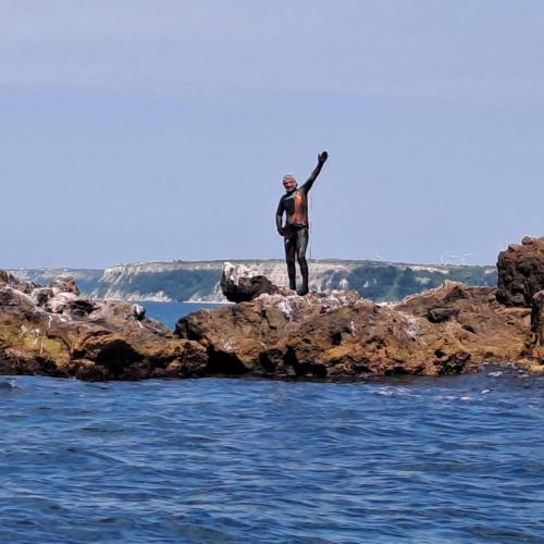 Там беше също много красиво и приятно. Гмурканията на Иван се подобряваха, но му се налагаше да прави по някоя и почивка. При една от почивките точно на скалите пред носа успяхме да направим едни ярките снимки на които си личи силата на волята му и желанието да продължава да прави любимите неща.