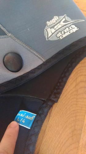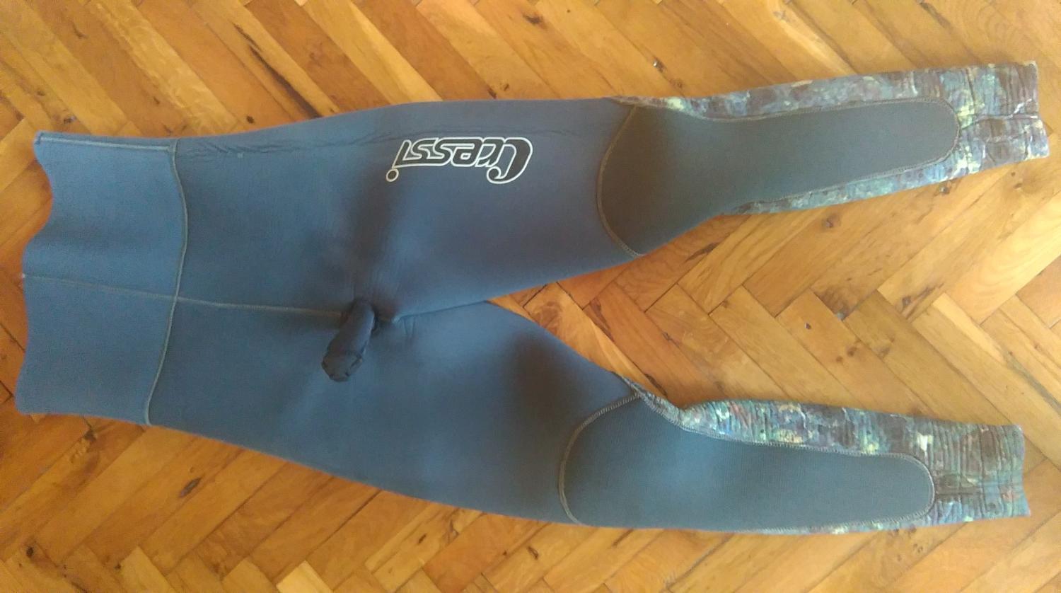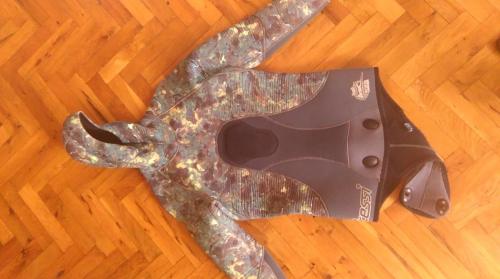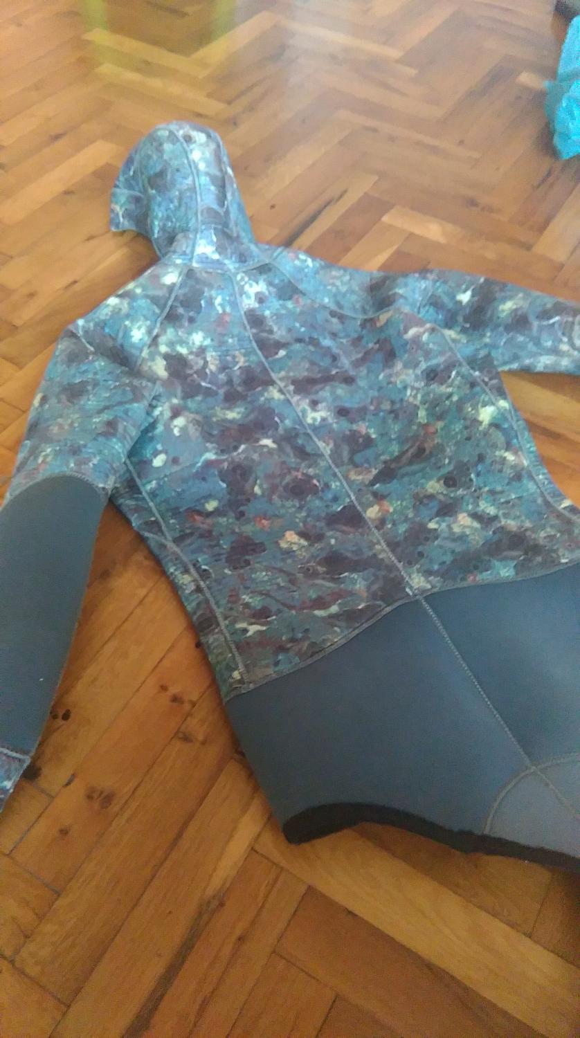 Неопренът е ползван три сезона.Има нормални следи от употреба,но не е скъсан или износен.Оригиналната му дебелина е 7мм. , като към момента е около 5-6мм, 3-ти размер.Единственото което видимо е износено е термотитаниевото покритие,което се е напукало.